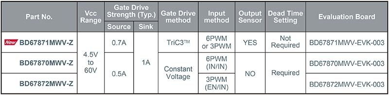 ROHM has developed the “BD67871MWV-Z” three-phase brushless DC motor gate driver for medium voltage applications (12 to 48V systems). By incorporating ROHM’s proprietary gate drive technology TriC3™, it greatly reduces FET’s switching loss while maintaining low EMI – traditionally a trade-off in motor driver ICs.
