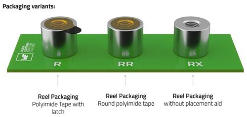 The “RX” option represents a different approach for mass production at Würth Elektronik. The SMT spacers “RX”, designed for large quantities, are supplied without film: Special nozzles on pick-and-place machines can pick up this SMT spacer variant without difficulty and place it precisely on the printed circuit board. Waste and the time-consuming removal of film are eliminated.
